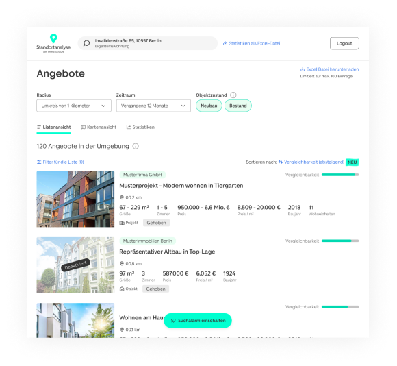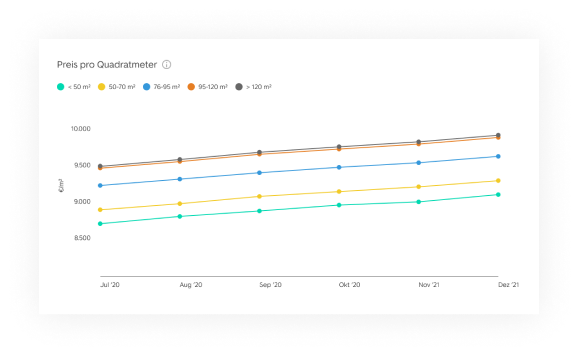Der spezialisierte Algorithmus, der in der Preistrendberechnung der ImmoScout24-Standortanalyse Anwendung findet, ist basierend auf aktuellen Angebots- und Transaktionsdaten, um eine realistische Preisentwicklung zu ermitteln.