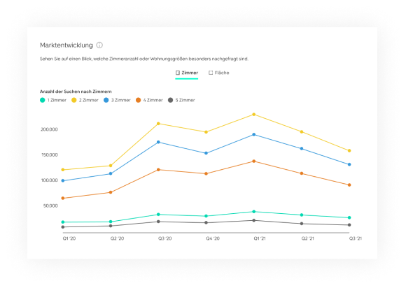 Suchintensität, Entwicklung und Verteilung der Nachfrage nach Zimmeranzahl und Wohnungsgröße, nachgefragte Größenspannen und Durchschnittsgrößen, Preisbereitschaft der Suchenden: Auf Basis der Daten von über 19 Mio. Nutzer:innen monatlich².