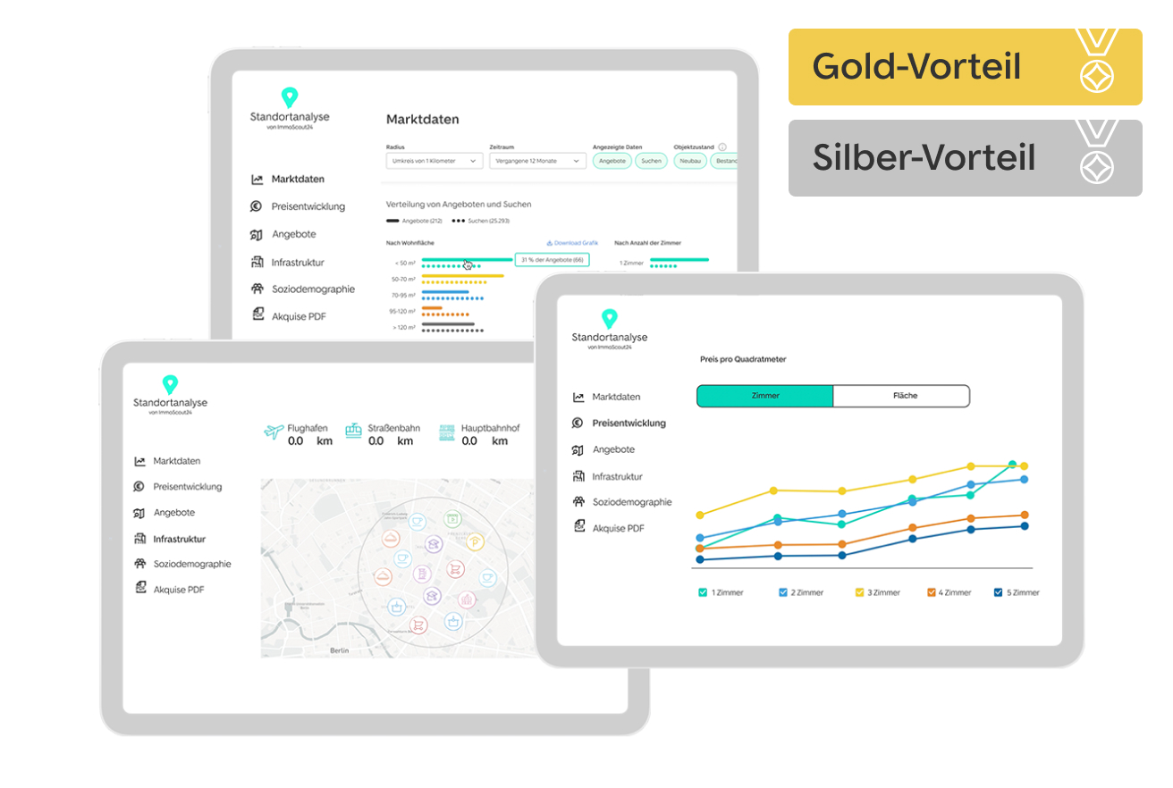 Die Standortanalyse von ImmoScout24 ist ein einzigartiges Daten-Tool, welches Angebotsdaten, Infrastrukturdaten, Daten zur Preisentwicklung, soziodemographische Daten und Nachfragedaten sowie Immobilienbewertung von Sprengnetter vereint – alles in einem Tool, jederzeit abrufbar für jede Adresse deutschlandweit.