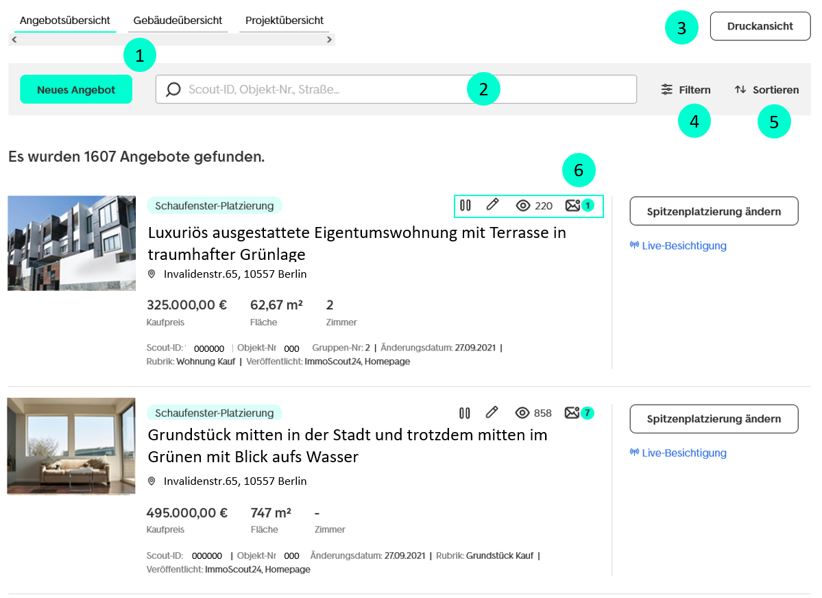 Alle Ihre Angebote bei ImmoScout24 sehen Sie in Ihrer Angebotsübersicht. Mit einem Klick auf die Überschrift eines Angebotes gelangen Sie schnell und gezielt zur Bearbeitung jedes gewünschten Angebot.