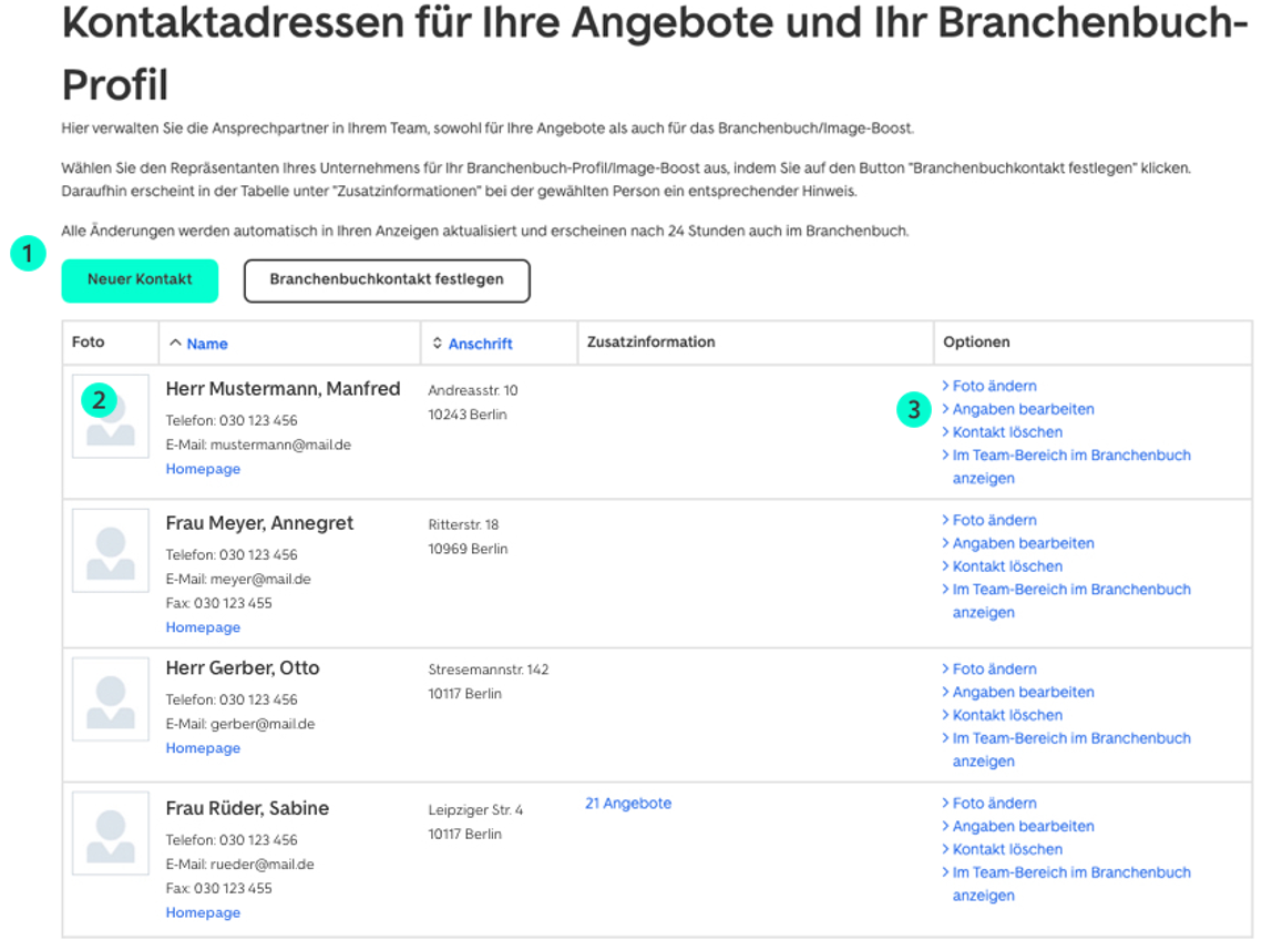 (3) Über die Links können Sie das Foto sowie die die Angaben bearbeiten/ändern. Auch kann hier der Kontakt wieder gelöscht werden.