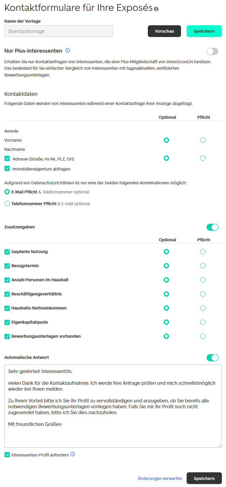 - Nur Plus-Interessent:innen: Erwarten Sie viele Anfragen? Nutzen Sie den Plus-Filter und erhalten nur Kontaktanfragen von Plus-Interessent:innen inkl. umfangreicherer Bewerbungsunterlagen. Diese Interessent:innen sind qualitativ hochwertige Kontakte, die ernsthaftes Miet- bzw. Kaufinteresse haben.
