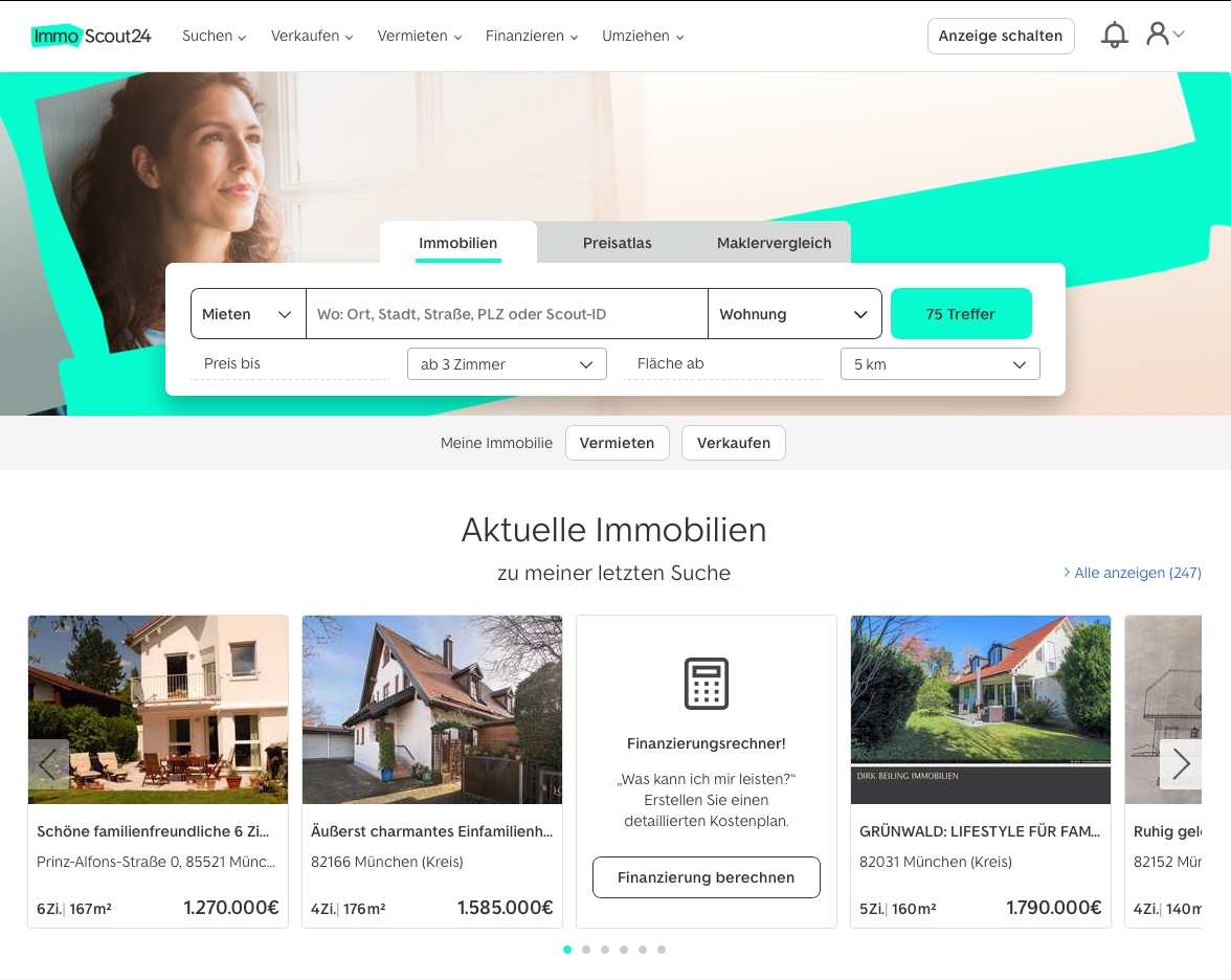 Die ImmoScout24-Homepage ist in neun Themenwelten eingeteilt: Wohnen, Anbieten, Gewerbe, Maklersuche, Neubau, Markt & Preise, Baufinanzierung, Umzug und Eigentümer:innen. Als Anbieter:in präsentieren Sie sich, also Ihr Unternehmen und Ihre Marke sowie Ihre Objekte, in der passenden Umgebung und werden von Interessent:innen und Eigentümer:innen schneller gefunden. Die Suchmaske bildet den zentralen Bereich der Seite.