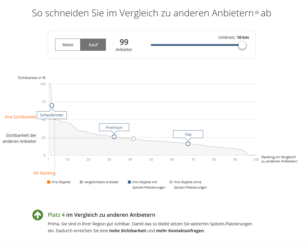 Wir vergleichen Sie mit bis zu 99 Makler:innen aus Ihrer Region mit demselben Vermarktungsschwerpunkt und ermitteln so Ihr Sichtbarkeits-Ranking. Auch sehen Sie, wie Ihre Objekte mit Spitzen-Platzierung im Ranking abschneiden.