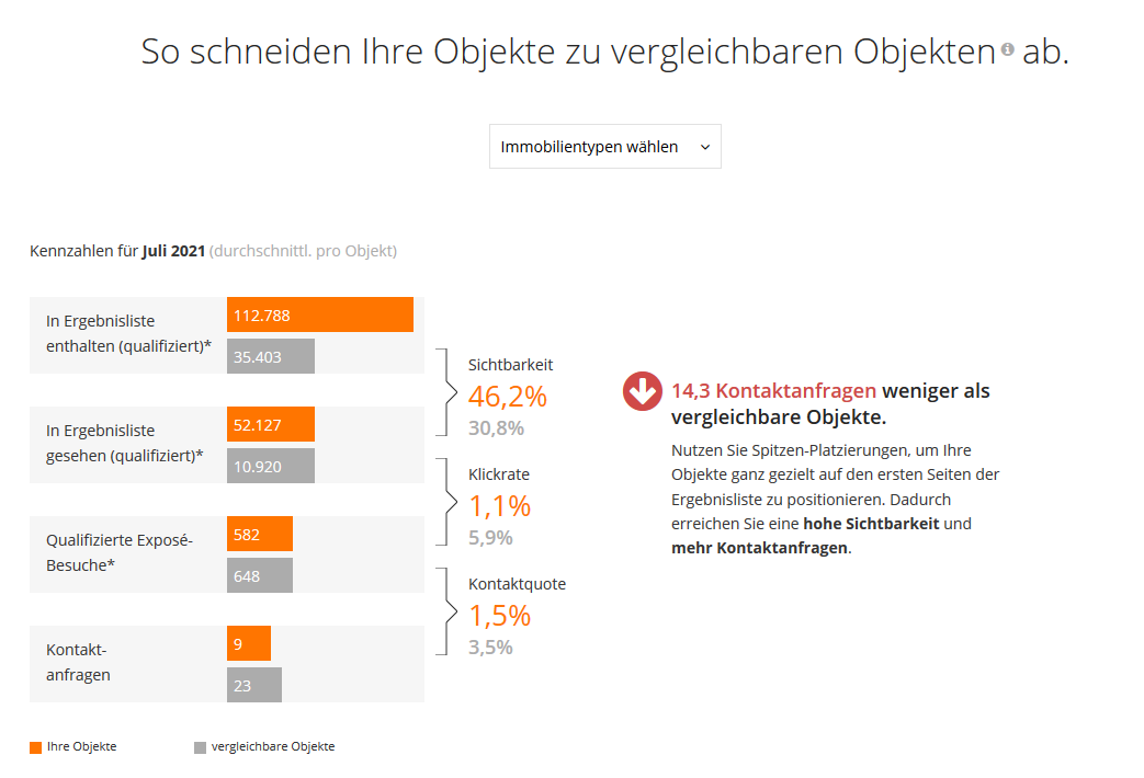 Die Kontaktquote wird aus dem Verhältnis von "Kontaktanfragen" zu "Exposéaufrufen" bestimmt.