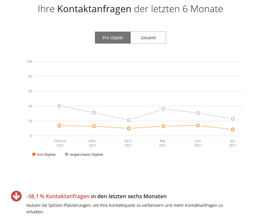 - Der Wert "Pro Objekt" zeigt Ihnen, wie viele Kontaktanfragen Sie pro Monat für ein Objekt im Schnitt erhalten haben. Sie sehen diesen Wert im Vergleich zum Wettbewerb über die letzten 6 Monate.