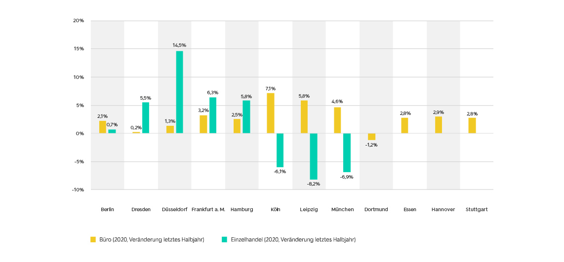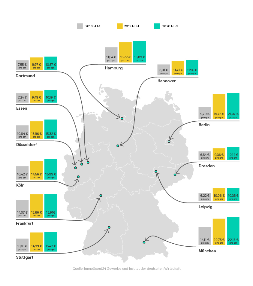 Infolge der Kontakteinschränkungen zur Eindämmung der Corona-Pandemie schickten zahlreiche Unternehmen ihre Mitarbeiter ins Homeoffice. Auf die angebotenen Büromieten wirkte sich das bislang nicht aus. Neun von zwölf der untersuchten Großstädte wiesen für die Angebotsmieten Zuwächse von mehr als zwei Prozent für das erste Halbjahr 2020 aus. Besonders stark wuchsen die Büromieten in Köln (+7,1 Prozent), Leipzig (+5,8 Prozent) und München (+4,6 Prozent). Dicht dahinter folgen Frankfurt am Main (+3,2 Prozent), Hannover (+2,9 Prozent), Stuttgart sowie Essen (jeweils +2,8 Prozent), Hamburg (+2,5 Prozent) und Berlin (+2,1 Prozent). Während Düsseldorf mit 1,3 Prozent eine vergleichsweise moderate Entwicklung für das erste Halbjahr 2020 aufwies, stagnierte in Dresden das Mietniveau für Büroimmobilien bei einer Preisentwicklung von 0,2 Prozent. Ausgenommen von der positiven Entwicklung ist Dortmund. Hier sanken die Büromieten im ersten Halbjahr 2020 geringfügig um 1,2 Prozent. Betrachtet wurde jeweils das halbjährliche Wachstum der Büromieten.
