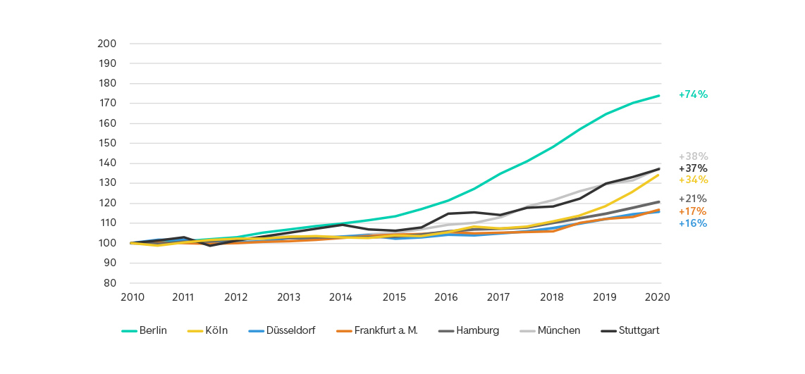 Rechnet man das Wachstum vom ersten Halbjahr 2020 auf ein Jahr hoch, würde sich für neun der zwölf betrachteten Städte ein stärkeres Mietpreiswachstum als im Durchschnitt der letzten 10 Jahre ergeben. So weist Berlin eine jährliche Wachstumsrate seit 2010 von 5,7 Prozent auf. In Leipzig (3,4 Prozent), München (3,2 Prozent), Stuttgart (3,2 Prozent) und Köln (3,0 Prozent) liegen die jährlichen Wachstumsraten seit 2010 über drei Prozent. In Essen ist die jährliche Wachstumsrate seit 2010 mit 0,5 Prozent am niedrigsten.