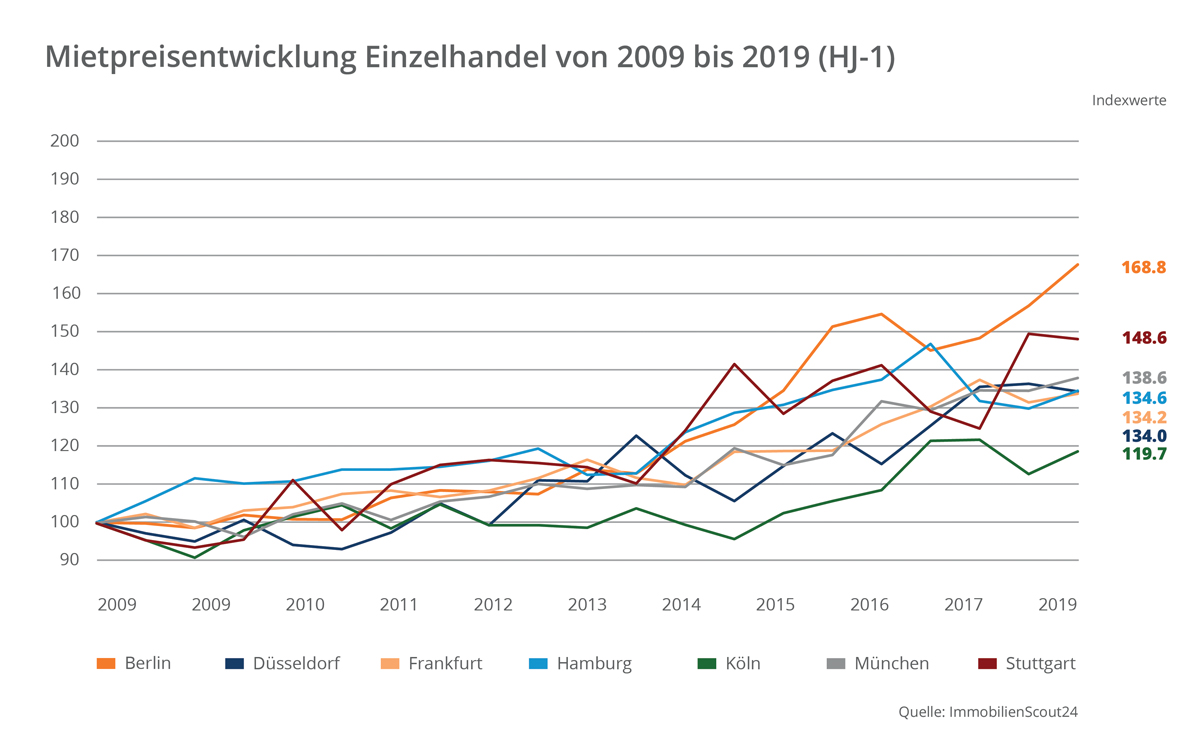 Klare Trends lassen sich auf den Märkten für Einzelhandelsimmobilien nicht ausmachen, die Marktentwicklungen sind stark lokal geprägt und reichen von 18,9 Prozent Mietwachstum in Stuttgart bis zu einem Rückgang der Gewerbemieten in Höhe von 2,7 Prozent in Frankfurt am Main (erstes Halbjahr 2019 zum ersten Halbjahr 2018). Leipzig verzeichnet ein Plus von 16,7 Prozent, in Berlin entwickelten sich die Mieten für Einzelhandelsimmobilien mit +13,1 Prozent ebenfalls positiv. Neben Frankfurt sanken die Mieten für Einzelhandelsimmobilien in Köln (-2,6 Prozent), Düsseldorf (-0,9 Prozent), Hannover (-1,0 Prozent) und Dortmund (-0,7 Prozent).