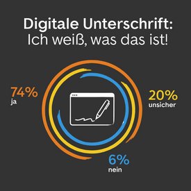 Verträge digital zu prüfen und digital zu unterschreiben, ist in Deutschland kein Neuland mehr. Drei von vier Befragten geben an, dass sie wissen, was eine digitale Unterschrift ist. Weitere 20 Prozent sind sich zwar nicht sicher, können sich aber zumindest etwas unter einer digitalen Unterschrift vorstellen. Gerade einmal 6 Prozent der Befragten haben noch nie etwas von der digitalen Signatur gehört.