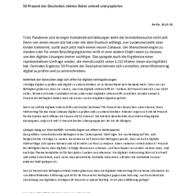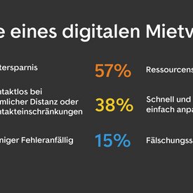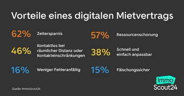 Den größten Vorteil sehen die Befragten in der Zeitersparnis: Statt tage- bis wochenlang auf hin- und hergeschickte Verträge zu warten, bewerten es 62 Prozent der Befragten positiv, dass sie durch digitale Mietverträge Zeit sparen können und nicht mehr zur Post zu müssen. Einen weiteren Vorteil sehen 57 Prozent der Befragten darin, dass digitale Verträge Ressourcen schonen, weil kein Papier verwendet werden muss. Und auch das Thema kontaktlos ist für fast jeden Zweiten von Interesse: Ein digitaler Mietvertrag lässt sich schnell und einfach abwickeln, auch wenn man persönliche Kontakte reduzieren will oder die Immobilie in einer anderen Stadt gelegen ist.