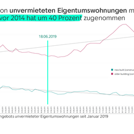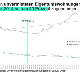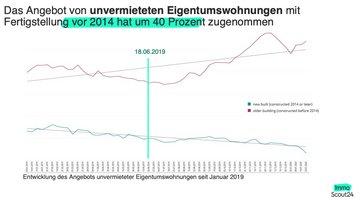 Die Analyse von ImmoScout24 zeigt, dass das über dem Mietendeckel liegende Mietangebot seit Anfang 2019 kontinuierlich um ca. 18 Prozent abnahm - seit dem Regulierungsstichtag 18. Juni 2019 etwa um 10 Prozent. Gleichzeitig ist seit Juli 2019 das Angebot an unvermieteten Eigentumswohnungen auf ImmoScout24 um 40 Prozent gestiegen. Auch bereits vermietete Eigentumswohnungen werden vertärkt angeboten (+ 25 Prozent).