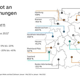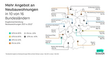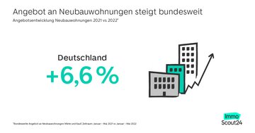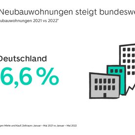 Für die Analyse von ImmoScout24 wurden alle neu eingestellten Inserate von Neubauwohnungen zur Miete und Kauf im Zeitraum Januar bis Mai 2021 im Vergleich zu Januar bis Mai 2022 berücksichtigt. Die Angebote im Markt wurden auf Basis der Inserate von ImmoScout24 sowie des Marktanteils hochgerechnet. Dabei wurden etwaige Mehrfacheinstellungen mit einberechnet, so dass jedes Inserat nur einmal in die Analyse einfloss, um eine valide Aussage über die Marktentwicklungen zu gewährleisten.