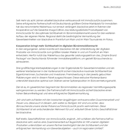 In den vergangenen Jahren konnte sich blackolive mit der Unterstützung der digitalen Produkte von ImmoScout24 zum größten lokalen Makler in und um Frankfurt am Main entwickeln. Hierfür nutzt das Maklerhaus das gesamte Leistungsspektrum des „Empire Brand Package“ von Deutschlands führender Immobilienplattform, um gezielt Bürosuchende zu adressieren.