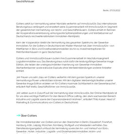 Colliers setzt zur Vermarktung seiner Mandate weiterhin auf ImmoScout24. Das internationale Beratungshaus verlängert und erweitert seine Zusammenarbeit mit ImmoScout24 im Segment der gewerblichen Vermarktung von Wohn- und Geschäftshäusern. Colliers erhält im Rahmen der Kooperationsvereinbarung wirkungsvolle Spitzenplatzierungen und Werbebanner auf Deutschlands reichweitenstärkstem Immobilien-Marktplatz.