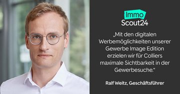 „Wir freuen uns sehr, dass wir Colliers weiterhin mit dem ganzen Spektrum unserer Vermarktungs-Power unterstützen können. Mit den digitalen Werbemöglichkeiten unserer Gewerbe Image Edition erzielen wir für Colliers maximale Sichtbarkeit in der Gewerbesuche“, erläutert Ralf Weitz, Geschäftsführer von ImmoScout24.
