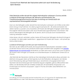 Methodik Im Auftrag von ImmoScout24 hat die Innofact AG vom 27. August bis 03. September 2021 eine Online-Befragung unter 1.007 Personen durchgeführt. Die Befragten wurden bevölkerungsrepräsentativ nach Alter (18 bis 65 Jahren) und Geschlecht ausgewählt,