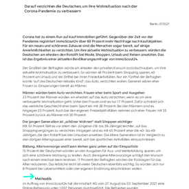 Im Auftrag von ImmoScout24 hat die Innofact AG vom 27. August bis 03. September 2021 eine Online-Befragung unter 1.007 Personen durchgeführt. Die Befragten wurden bevölkerungsrepräsentativ nach Alter (18 bis 65 Jahren) und Geschlecht ausgewählt.