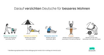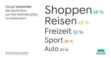 15 Prozent der Deutschen würden an den Ausgaben für Aus- und Weiterbildung sparen, um sich eine schönere Wohnung zu leisten. Auch die eigene Altersvorsorge schlägt den Wunsch nach einem Wechsel beim Wohnen. 11 Prozent der Befragten würden die Rücklagen für das Alter reduzieren. Das leibliche Wohl ist vielen Deutschen ebenfalls wichtig. So würden sich nur 8 Prozent bei Lebensmitteln oder der eigenen Ernährung einschränken wollen.