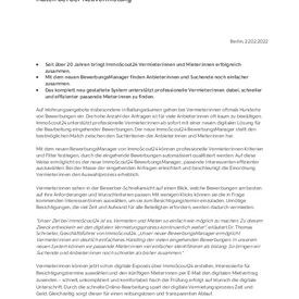 - Das komplett neu gestaltete System unterstützt professionelle Vermieter:innen dabei, schneller und effizienter passende Mieter:innen zu finden.