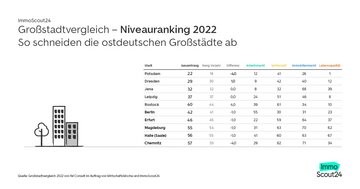 Aufgrund der außergewöhnlich starken Entwicklung in Mainz, das im Dynamikranking auf Platz 1 geschossen ist, rutscht Berlin in diesem Jahr von seiner Spitzenposition auf Platz 2. Potsdam verliert mit 31 Plätzen im Vergleich der ostdeutschen Großstädte am meisten, belegt dafür im Niveauranking mit Platz 22 die höchste Platzierung in Ostdeutschland. Auch Chemnitz und Dresden büßen 12 bzw. 7 Ränge im diesjährigen Dynamikranking ein. Damit verliert Dresden die Platzierung in der Top20. Chemnitz rutscht ab auf Platz 62. In beiden Städten birgt insbesondere der Immobilienmarkt noch Verbesserungspotential. Dresden landet in diesem Bereich nur im unteren Drittel des Rankings; Chemnitz bildet das Schlusslicht.