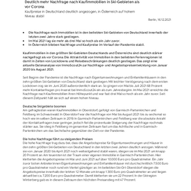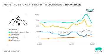 Kaufimmobilien in den größten Ski-Gebieten Deutschlands und Österreichs sind deutlich stärker nachgefragt als vor Corona. Die Attraktivität von Immobilien in den beliebten Ferienregionen ist damit in Zeiten von Lockdowns und Reisebeschränkungen deutlich gestiegen. Das zeigt eine aktuelle Datenanalyse von ImmoScout24 zur Nachfrage- und Angebotspreisentwicklung von Januar 2020 bis August 2021.