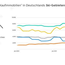 Seit Beginn der Pandemie ist die Nachfrage nach Eigentumswohnungen und Einfamilienhäusern in den zehn größten Ski-Gebieten von Deutschland stark gestiegen. Mit leichter Verzögerung nach dem ersten Lockdown zog sie im Juni 2020 außerordentlich stark an. So gingen von Mai bis Juli 2021 68 Prozent mehr Kontaktanfragen pro Inserat bei ImmoScout24 ein als zum Jahresbeginn. Im Mai 2021 erreichte die Nachfrage nach Kaufimmobilien ihren Höhepunkt und war fast drei Mal so hoch als ein Jahr zuvor. Seit diesem Zeitpunkt hält sie sich auf einem hohen Niveau.
