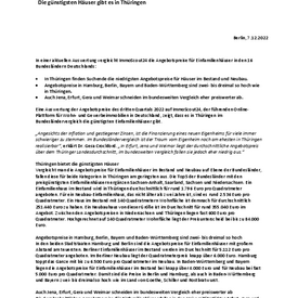 Eine Auswertung der Angebotspreise des dritten Quartals 2022 auf ImmoScout24, der führenden Online-Plattform für Wohn- und Gewerbeimmobilien in Deutschland, zeigt, dass es in Thüringen im Bundesländervergleich die günstigsten Einfamilienhäuser gibt.