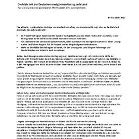 Für den Umzug aufs Land spricht für zwei Drittel der Befragten der Zugewinn an Ruhe. Für knapp zwei Drittel (64 Prozent) ist die Nähe zur Natur und für 61 Prozent die Möglichkeit einen Garten zu haben ansprechend. Darüber hinaus spielen die günstigeren Wohnkosten bei jedem zweiten eine wichtige Rolle bei der Abwägung. Während im Durchschnitt der sieben größten Metropolen Deutschlands die Angebotsmiete für eine Bestandswohnung bei 13,51 Euro pro Quadratmeter liegt, so fällt sie im deutschlandweiten Durchschnitt mit 8,01 Euro deutlich günstiger aus. Auf 70 Quadratmeter gerechnet, ergibt sich ein Preisunterschied von 385 Euro pro Monat. Gesündere Umweltbedingungen, wie zum Beispiel weniger Autoabgase, nennen 41 Prozent der Befragten als Argument für den Umzug aufs Land.