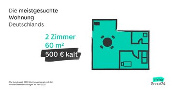 ImmoScout24 hat die meistgesuchten Mietwohnungen Deutschlands analysiert. Die Daten zeigen, welche Wohnungen am stärksten nachgefragt sind und mit wie vielen Mitbewerbern bei entsprechenden Inseraten zu rechnen ist. Über ganz Deutschland betrachtet, hat die meistgesuchte Mietwohnung zwei Zimmer mit 60 Quadratmetern Wohnfläche und kostet rund 500 Euro Kaltmiete.