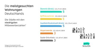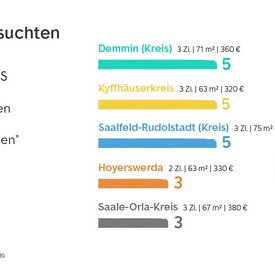 In lediglich 21 von 417 Kreisen und Städten liegen die Zahlen der Interessenten auf die dort meistgesuchten Wohnungen im einstelligen Bereich und damit relativ niedrig. Am entspanntesten sind die Mietwohnungsmärkte in Hoyerswerda sowie im Saale-Orla-Kreis. In der sächsischen Stadt Hoyerswerda hat die meistgesuchte Wohnung zwei Zimmer mit 63 Quadratmetern und wird für 330 Euro Kaltmiete angeboten. Rund drei Mietinteressenten fragen solche Wohnungsinserate im Durchschnitt an. Auch im Saale-Orla-Kreis kommen im Mittel drei Anfragen auf Wohnungsinserate mit drei Zimmern und 67 Quadratmetern für 380 Euro kalt.