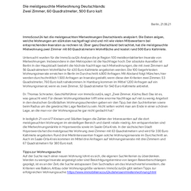 Ausgewertet wurden die 100 Wohnungsinserate je Region mit den meisten Interessentenanfragen im Gesamtjahr 2020. Es wurde der Mittelwert gebildet über die Parameter Wohnfläche, Zimmer, Kaltmiete, Kontaktanfragen. Insgesamt sind 41.700 Wohnungsinserate in die Auswertung eingeflossen.