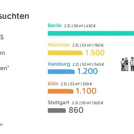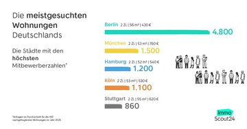 Untersucht wurden für die ImmoScout24-Analyse die je Region 100 meistkontaktierten Inserate von Mietwohnungen. Insbesondere in den Metropolen ist die Nachfrage hoch. Der absolute Ausreißer ist Berlin: In der Hauptstadt besteht die höchste Nachfrage nach Mietwohnungen, die mit zwei Zimmern auf 56 Quadratmetern Wohnfläche für 430 Euro Kaltmiete angeboten werden. Die 100 begehrtesten Wohnungsinserate erreichen in Berlin im Durchschnitt 4.800 Anfragen. Mit Abstand folgt München, hier werden durchschnittlich 1.500 Anfragen an Inserate gestellt, wenn diese den Kriterien zwei Zimmer, 53 Quadratmeter, 760 Euro kalt nahekommen. In Hamburg kommen im Mittel 1.200 Anfragen auf ein Wohnungsinserat, wenn es zwei Zimmer, 52 Quadratmeter für 540 Euro Kaltmiete anbietet.