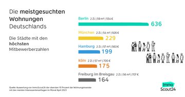 Vier der fünf Städte mit den höchsten Mitbewerberzahlen auf die meistgesuchte Wohnung Deutschlands sind Metropolen. In Berlin ist das Angebot geprägt von 1-Zimmer-Wohnungen, die 41 Prozent aller Mietwohnungsinserate in der Hauptstadt ausmachen. Die meistgesuchte Wohnung in Berlin hat hingegen zwei Zimmer, ist 59 Quadratmeter groß und kostet 554 Euro kalt. Auf diese Wohnung bewerben sich im Durchschnitt 636 Mietsuchende pro Tag. Damit ist Berlin absoluter Spitzenreiter. München folgt mit 229 Bewerber:innen pro Tag für Wohnungen mit durchschnittlich zwei Zimmern und 54 Quadratmetern für 926 Euro kalt. Auf Platz drei landet Hamburg mit 199 Interessent:innen für Wohnungen mit zwei Zimmern, 57 Quadratmetern und einer Kaltmiete von 563 Euro. Die vierte Metropole ist Köln mit 175 Mitbewerber:innen auf die meistgesuchte Wohnung. In Freiburg im Breisgau, einer Universitätsstadt im Schwarzwald, ist die Nachfrage ähnlich hoch: 164 Menschen bewerben sich hier innerhalb eines Tages auf die meistgesuchte Wohnung.