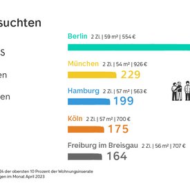 - In Berlin, München, Hamburg, Köln und Freiburg in Breisgau haben Miet-Inserate die meisten Bewerber:innen.