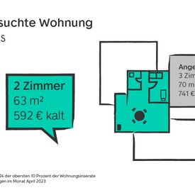 Die meistgesuchte Mietwohnung Deutschlands hat zwei Zimmer, ist 63 Quadratmeter groß und kostet 592 Euro kalt. Das entspricht einem durchschnittlichen Quadratmeterpreis von 9,39 Euro. Die Realität sieht jedoch anders aus: Im Angebot sind Mietwohnungen mit drei Zimmern und 70 Quadratmetern für 741 Euro im Monat, bzw. 10,59 Euro pro Quadratmeter, am stärksten vertreten. Damit sind die angebotenen Mietwohnungen 10 Prozent größer und 25 Prozent teurer als das, was gesucht wird, und sprengen den finanziellen Rahmen vieler Mietsuchenden.
