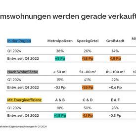 Lage ist weiterhin Trumpf. Insbesondere Wohnungen in den nachfragestarken Metropolregionen gehen vom Markt. Mit 38 Prozent liegt der Großteil der Eigentumswohnungen, die im ersten Quartal 2024 verkauft wurden, in den acht größten Metropolen Deutschlands. Der Anteil der Metropolwohnungen an den verkauften Eigentumswohnungen ist im Vergleich zum ersten Quartal 2022 um 5 Prozentpunkte gestiegen. Wohnungen im Speckgürtel belegen mit einem Anteil von 26 Prozent den zweiten Platz. Der dritte Platz geht mit 19 Prozent an Wohnungen im ländlichen Raum, die gegenüber dem ersten Quartal 2022 jedoch rund 1 Prozentpunkt verlieren. Bei den Einfamilienhäusern zeigt sich ein ähnlicher Trend: Das „Haus im Grünen“ im ländlichen Raum ist unter den Einfamilienhäusern mit 41 Prozent zwar noch die am stärksten verkaufte Kategorie, doch verliert diese im Zweijahresvergleich rund 6 Prozentpunkte. Die Einfamilienhäuser im urbanen Raum, der die Metropolen, den Speckgürtel und andere Großstädte umfasst, gewinnen im gleichen Zeitraum hinzu.