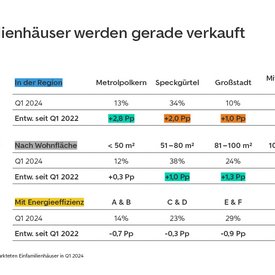 Mit Blick auf die Wohnfläche der Immobilien, die gerade verkauft werden, zeigt sich, dass Zwei- bis Drei-Zimmer-Wohnungen mit 51 bis 80 Quadratmetern mit 41 Prozent den größten Anteil ausmachen, jedoch seit 2022 rund 2 Prozentpunkte einbüßen. Auffällig ist, dass große Wohnungen mit mehr als 120 Quadratmetern einen größeren Anteil an den verkauften Wohnungen ausmachen als noch vor zwei Jahren. Diese bieten genug Platz für eine Familie mit Kindern. Die Wohnfläche der großen Wohnungen entspricht in etwa der Wohnfläche der mit 38 Prozent am meisten verkauften Einfamilienhäuser mit 101 bis 150 Quadratmetern. Sehr große Häuser mit mehr als 250 Quadratmetern Wohnfläche verlieren im Zweijahresvergleich 2,5 Prozentpunkte.