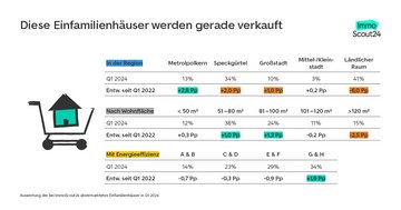 Die Auswertung berücksichtigt alle Angebote von Eigentumswohnung und Einfamilienhäusern zum Kauf, die jeweils im ersten Quartal 2022 bzw. 2024 bei ImmoScout24 inseriert waren und nach erfolgter Kontaktaufnahme deaktiviert, also vom Portal und somit aus der Vermarktung genommen wurden.