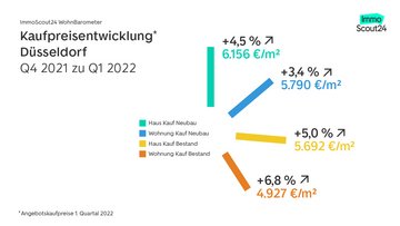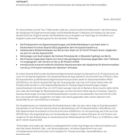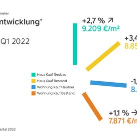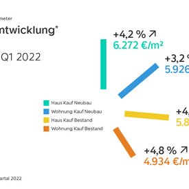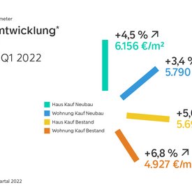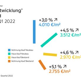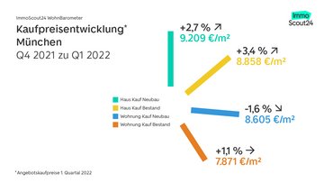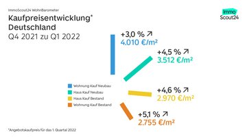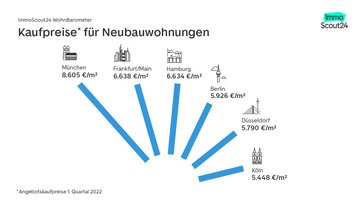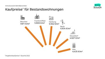 Für Deutschland und die Top-7-Metropolen stellt das „ImmoScout24 WohnBarometer“ die Entwicklung der Kaufpreise für Eigentumswohnungen und Einfamilienhäuser in Bestand und Neubau für das erste Quartal 2022 dar. Ergänzt werden die Marktdaten durch Angaben zur Nachfrage im Verhältnis zum Angebot sowie eine Preisprognose für die nächsten 12 Monate.