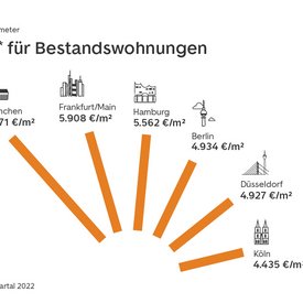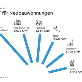 In Düsseldorf zogen die Angebotspreise für Bestands-Eigentumswohnungen um 6,8 Prozent an. Neubau-Wohnungen wurden 3,4 Prozent teurer angeboten als im vierten Quartal 2021. Im Vergleich mit den anderen Top-7-Metropolen liegen die Angebotspreise in Düsseldorf dennoch mit 4.927 Euro pro Quadratmeter im Bestand und 5.790 Euro im Neubau im unteren Drittel. Berlin folgt mit einer Preissteigerung von 4,8 Prozent im Bestand und 3,2 Prozent im Neubau. Damit liegt die Bundeshauptstadt annährend im bundesweiten Mittel. In der Bundeshauptstadt forderten Anbieter:innen im ersten Quartal 2022 im Durchschnitt für eine Bestandswohnung 5.926 Euro pro Quadratmeter für eine Neubauwohnung zum Kauf. Der mittlere Angebotskaufpreis für eine Bestands-Wohnungen in Berlin liegt mit 4.934 Euro knapp 1.000 Euro unter dem Preisniveau von Frankfurt am Main mit 5.908 Euro und fast 3.000 Euro unter dem Angebotspreis in Münchenmit 7.871 Euro.