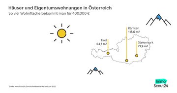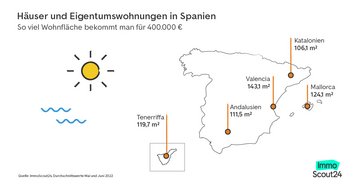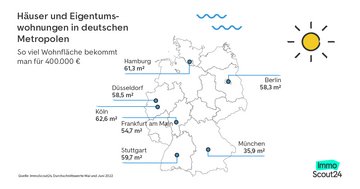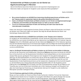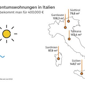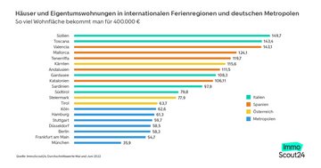 Für die Analyse von ImmoScout24 wurden alle in den Monaten Mai und Juni 2022 eingestellten Inserate von Eigentumswohnungen und Häusern zum Kauf mit einem Angebotspreis von bis zu 400.000 Euro für die folgenden Regionen berücksichtigt: Toskana, Gardasee, Südtirol, Sardinien und Sizilien für Italien, Andalusien, Katalonien, Valencia, Mallorca und Teneriffa für Spanien, Kärnten, Steiermark und Tirol für Österreich sowie die sieben größten deutschen Städte Berlin, Düsseldorf, Frankfurt am Main, Hamburg, Köln, München und Stuttgart. Dabei wurden etwaige Mehrfacheinstellungen berücksichtigt, so dass jedes Inserat nur einmal in die Analyse einfloss.