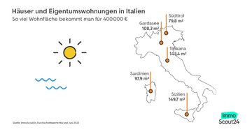 Im Vergleich der drei beliebtesten Urlaubsländer mit den deutschen Metropolen bekommen Suchende für 400.000 Euro am meisten Wohnfläche auf der italienischen Insel Sizilien (149,7 m2). Dahinter folgt die Toskana (143,4 m2) in Mittelitalien gleichauf mit der Hafenstadt Valencia (143,1 m2) im Südosten Spaniens. Das hat eine aktuelle Auswertung von ImmoScout24 ergeben. Die Grundlage der Auswertung bilden die im Mai und Juni auf der Plattform von ImmoScout24 veröffentlichten Inserate mit einem Angebotspreis von bis zu 400.000 Euro.
