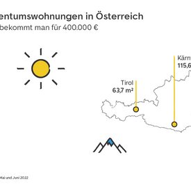 Berge und Seen anstelle von Strand und Meer finden Suchende in Südtirol, Tirol und der Steiermark. Hier bekommen Käufer:innen im Vergleich am wenigsten Wohnfläche fürs gleiche Budget. Die Inserate in Südtirol in Italien boten im Durchschnitt rund 80 Quadratmeter. Damit liegt die italienische Alpenregion beinah gleichauf mit der österreichischen Steiermark (77,9 m2). Tirol, in den Alpen Österreichs, schneidet im Vergleich zum nahegelegenen Südtirol in Italien etwas schlechter ab. Mit rund 64 Quadratmetern für 400.000 Euro liegen die Kaufpreise in Tirol auf einem ähnlichen Niveau wie in Köln (62,6 m2) und Hamburg (61,3 m2).
