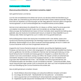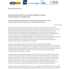 Dennoch sieht der Zusammenschluss der Branchen-Schwergewichte weiterhin dringenden Handlungsbedarf: „Wohnen ist ein Grundbedürfnis. Immobilien sind ein wesentlicher Baustein der Altersvorsorge. Für eine gesunde und starke Volkswirtschaft brauchen wir eine genauso gesunde und stabile Immobilienwirtschaft. Die aktuellen Herausforderungen sind nicht nur temporär, sondern werden zur neuen Normalität. Im Interesse aller Marktteilnehmer – Immobiliensuchenden, Eigentümern, Maklern und Verwaltern – müssen wir darauf geeignete Antworten finden. Digitale Lösungen funktionieren kontaktlos und werden die Abläufe stark vereinfachen und beschleunigen. Nur mit einem Digitalisierungsschub können wir die Funktionsfähigkeit des Immobilienmarktes weiterhin sicherstellen.“