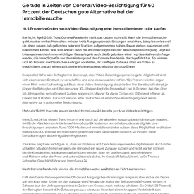 ImmoScout24 hat diesen Trend erkannt und rasch auf die aktuellen Ausgangsbeschränkungen reagiert. Seit Ende März können Anbieter auf ImmoScout24 kostenlos hervorheben, dass sie digitale Live-Besichtigungen anbieten. Rund 1000 Makler und Immobilienanbieter nutzen diese Möglichkeit und haben mehr als 16.000 Inserate entsprechend gekennzeichnet. Sie erhalten dadurch 40 Prozent mehr Kontaktanfragen als bei regulären Angeboten.