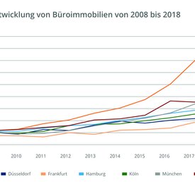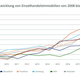 Die auf lange Sicht positive Marktentwicklung bei den Einzelhandelsmieten ist allerdings in der kurzfristigen Betrachtung von einigen negativen Trends belastet, was bei den Büromieten nicht der Fall ist. So sind zwischen Ende 2017 und Ende 2018 in Hamburg die Einzelhandelsmieten um 11,1 Prozent eingebrochen und in Stuttgart um 3,9 Prozent zurückgegangen.