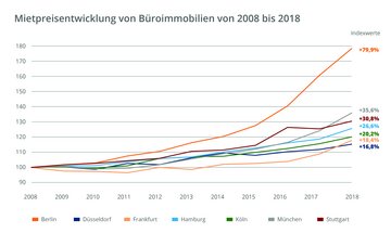 Vor allem in Großstädten, wo immer mehr Arbeitsplätze für Hochqualifizierte mit entsprechendem Einkommen und Erwartungen an ein modernes Arbeitsumfeld entstehen, ging der Trend nach oben. Spitzenreiter der Mietpreisentwicklung ist Berlin: Hier wurde im Langzeitvergleich seit 2008 ein Anstieg bei den Büromieten von 79,9 Prozent verzeichnet. Münchner Büromieten wuchsen im selben Zeitraum um 35,6 Prozent, in Stuttgart ging es um 30,8 Prozent nach oben. Dahinter liegen Hamburg (26,6 Prozent), Köln (20,2 Prozent), Frankfurt (18,4 Prozent) und Düsseldorf (16,8 Prozent).