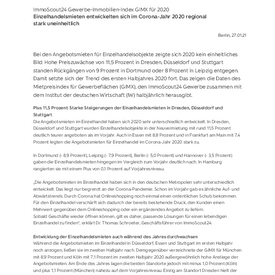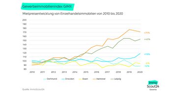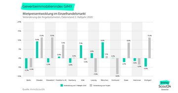 Die Angebotsmieten im Einzelhandel haben sich 2020 sehr unterschiedlich entwickelt. In Dresden, Düsseldorf und Stuttgart wurden Einzelhandelsobjekte in der Neuvermietung mit rund 11,5 Prozent deutlich teurer angeboten als im Vorjahr. Auch in Essen mit 8,8 Prozent und in Frankfurt am Main mit 7,4 Prozent legten die Angebotsmieten für Einzelhandel im Corona-Jahr 2020 stark zu.