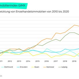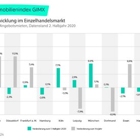 Während die Angebotsmieten im Einzelhandel in Düsseldorf, Essen und Stuttgart im ersten Halbjahr noch anzogen, ließen sie im zweiten Halbjahr nach. Demgegenüber verzeichnete der GIMX für München mit 8,9 Prozent und Köln mit 7,1 Prozent im zweiten Halbjahr 2020 außergewöhnlich hohe Anstiege der Angebotsmieten. Am Ende des Jahres lagen die beiden Standorte jedoch mit minus 1,0 Prozent (Köln) und plus 1,1 Prozent (München) nahezu auf dem Vorjahresniveau. Einzig am Standort Dresden hielt der Trend von Preiszuwächsen bei neuvermieteten Einzelhandelsmieten sowohl im ersten als auch im zweiten Halbjahr (9,4 bzw. 11,5 Prozent) an.